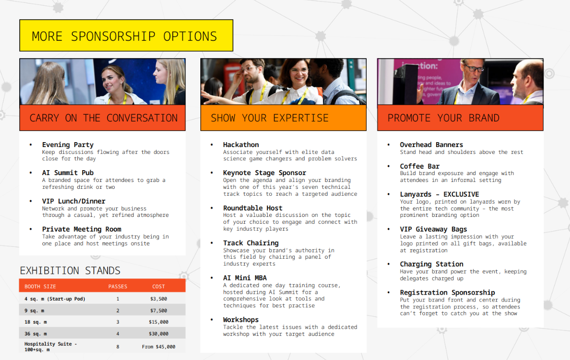 To discuss any of these packages or other sponsorship opportunities available at The AI Summit London 2024, please contact your account manager or drop us a line.